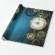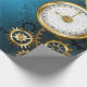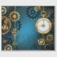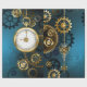 Turquesa, texturizada, fundo steampunk com latão e engrenagens douradas, chave prateada e relógio. Estilo Steampunk.