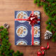 Legal papel de embrulho desportivo personalizável, em azul desportivo, com uma criança jogadora de futebol a vestir um uniforme de quarterback vermelho e prateado. Personalize com o nome do seu filho em branco. Um plástico de presente de festa de aniversário temático de futebol excelente.