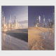 The image showcases a futuristic cityscape rising from a desert landscape. Tall, modern skyscrapers with reflective surfaces dominate the horizon, illuminated by a warm, golden light. The foreground features sand dunes with subtle ripples and a body of water reflecting the city's skyline. The sky transitions from a deep blue to a soft, pastel hue near the horizon.