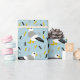 Este papel de embrulho apresenta ilustrações bonitas no estilo de desenho animado de gaivotas brancas, cinzas, pretas e laranja com peças de confete coordenadas colocadas sobre um fundo azul claro.