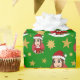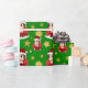 O papel de embrulho de Natal com uma ilustração de uma menina sorridente com cabelo castanho, a menina está vestindo uma fantasia de Papai Noel com um chapéu vermelho e segurando um presente. Num fundo verde sem soldadura com estrelas. Com um modelo de texto personalizável para seu nome ou mensagem.
