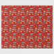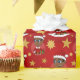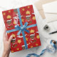 Papel de embrulho de Natal com ilustração de um sorridente rapaz afro-americano com cabelo e óculos pretos curtos, o menino está vestindo uma fantasia de Papai Noel com um chapéu vermelho e segurando um presente; em um círculo vermelho sobre um fundo vermelho com estrelas, um design de feriado de Natal com um modelo de texto editável para seu nome ou mensagem