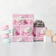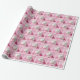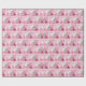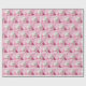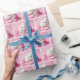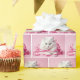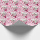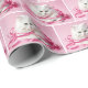 Bonito gato branco com olhos verdes enredados em fitas cor-de-rosa sobre fundo rosa e borda branca.