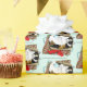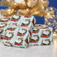 Um gato calico gordinho está numa caixa de Natal aberta de brinquedos e é mais feliz com a caixa e depois com os brinquedos
