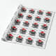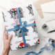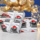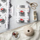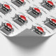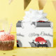 Um gato surrado que entrou numa caixa de presentes de Natal. O gato está vestindo um chapéu vermelho de Papai Noel. O slogan lê surpresa. O slogan diz Feliz Natal. O quadro é preto e branco exceto os gatos vermelhos do chapéu de Papai Noel.
