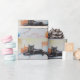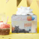 O gato preto desafiante olha fixamente em nós de sua posição confortável sobre a cama de casal com suas duas bolas favoritas do fio! Nightstand com a lâmpada no fundo. Uma cena da felicidade doméstica - pelo menos ao gato do gatinho! Katherine ama gatos. Da série animal da coleção da aguarela de Katherine Foltuz.