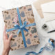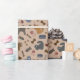 Esta design apresenta cartoons em várias poses, cercada por estampas, bolas de fio, ossos de peixe, brinquedos de gato, tigelas de comida e ossos sobre um fundo marrom-claro. Ideal para as crianças, este papel de embrulho traz um charme divertido e temático para qualquer presente.