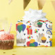 Este é um design brilhante e alegre com desenhos bonitos, animados, gatos siameses tocando entre todos os tipos de decorações coloridas de festas e presentes. Os gatos estão entre balões, fitas e arcos, cupcakes e velas, e presentes nas cores primárias de vermelho, azul, amarelo e verde. Estrelas de cor clara completam o design contra um fundo branco brilhante.