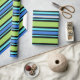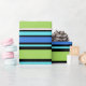 Um rolo de papel de enrolamento de luxo, com um padrão listrado de "cadeira de decco" em blues brilhantes e verde neon e preto. Parte da coleção Posh & Painterly 'Blue Moons'; de um design de colagem de papel pintado à mão por Judy Adamson.