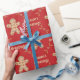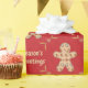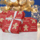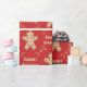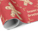 Aqui temos um papel de embrulho que apresenta um recorte de um biscoito de pão de gengibre com muitos biscoitos dentro dele, e as palavras Sasons Saudações dentro de um quadro feito de pinos rolantes com bolinhas leves em um fundo vermelho profundo. Este documento está disponível em vários tamanhos e corresponde a outros papéis de embalagem, papéis de tecidos, sacos de presentes e um cartão de saudação. Isso certamente fará uma adição perfeita aos seus presentes nesta temporada de festas.