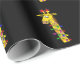 Este engraçado, lunático, papel de envolvimento do design do Natal tem um girafa dos desenhos animados toda decked para fora para a estação. Tem uma corda das luzes coloridas que circundam seu pescoço e dois vermelhos, incandescendo stars em superior seus chifres. O teste padrão é repetido por todo o lado no giftwrap, em um fundo preto.