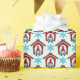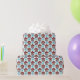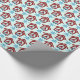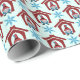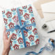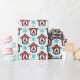 Este papel de embrulho é embelezado com um padrão gráfico temido de Natal de gnomos repetitivos que se encontram à porta de uma cabana escandinava vermelha, intercalada com flocos de neve azuis. A cor de fundo pode ser personalizada.