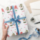 Papel de embrulho de férias bonito, com três gnomos de estilo escandinavo, com chapéus e tunicados de vermelho, verde e dourado, de cor vermelha. Personalize a saudação "Feliz Natal" (por exemplo, "Felizes Feriados") em tipografia vermelha divertida.