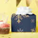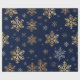 This image features a roll of elegant gift wrapping paper decorated with large, artistic gold-colored snowflake designs set against a deep navy blue background. The pattern includes various intricate snowflake shapes, some highlighted with a gold metallic effect and others in subtle contrasting tones. This luxurious and festive wrapping paper is perfect for holiday gifts, especially during winter or Christmas celebrations, adding a sophisticated and sparkling touch to any present.