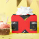 Boné de formatura preto e ouro sobre fundo vermelho. Editar texto para adicionar o nome do formando e o ano.