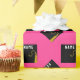 Molho de presente e decoração de festa de formatura rosa-quente criativa com formando preto e boné de formatura em fundo rosa. Editar texto para adicionar o nome do formando e o ano.