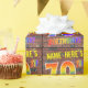 Este design de papel embrulhado, empolgante e vibrante, com tema de aniversário, apresenta um nome personalizado, e a mensagem "70 BIRTHDAY!" com letras que têm um espectro multicolorido de arco-íris inspirado num padrão de gradiente inspirado na parede de tijolos. A aparência é inspirada pela arte de rua ou pelo grafite desenhado em uma parede. O papel de embrulho temático de aniversário como este pode ser uma maneira divertida de embrulhar um presente ou de apresentar a alguém que comemora seu setuagésimo aniversário. [~Z0000369]