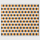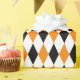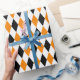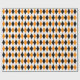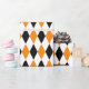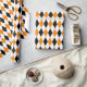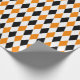 Papel de embrulho concebido com um padrão de harlequina preto, laranja e branco, de grande dimensão. Personalize a cor branca de fundo entre outras opções.