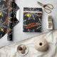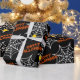 Este legal papel de embrulho com teias de aranha e aranhas sobre fundo preto é perfeito para o Halloween. Orange Happy Halloween.