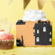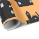 Esta engraçada folha de papel é perfeita para o Dia das Bruxas. Esta design de diversão apresenta um padrão com um fundo laranja e uma casa assombrada preta.