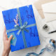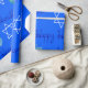 Este papel de embrulho tem um design de sonho Chanucá, Estrela de David, e "Feliz Chanucá" em um fundo azul. Excelente para a estação.