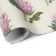 The protea blooms in warm pinks and silvery whites, unfolding gracefully from rich green leaves. The beige backdrop echoes the tones of fynbos soil and ancient landscapes, grounding the pattern in a sense of heritage and belonging. The combination creates a calm, elegant rhythm that makes every wrapped gift look thoughtful and beautifully composed.