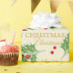 Design de tipografia de texto de Natal feliz em fundo creme com Holly e arcos vermelhos. Tema festivo adorável para os feriados.