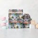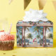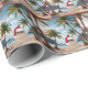 Neve branca com boné de Papai Noel em uma praia com palmeiras