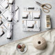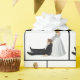 Noiva arrastando o noivo pelo seu colar de smoking em fundo branco.