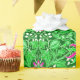 Papel de embrulho em uma safra do padrão William Morris de hyacintos, tulipas e folhas, em tons de verde limão, acentuado com fuchsia cor-de-rosa e branco, sobre fundo esmeraldo verde