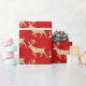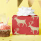 Papel de embrulho de ouro e borrado, neutro, com padrão repetido de renas de escadas de ouro contra fundo sólido vermelho de Natal.