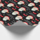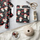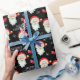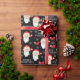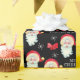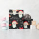Este papel de embrulho de presente de Natal apresenta um gráfico de Papai Noel e é acentuado com arcos e flocos de neve no fundo preto.