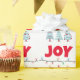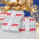 Texto "Joy" com luz de Natal e três árvores de Natal azuis.