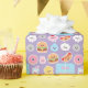 This pattern is special for its incredibly cute, whimsical fast food theme. It features a seamless repeating design of smiling kawaii characters, a burger, hot dogs, cheese, and donuts. The arrangement creates a central square frame with rounded corners, making it perfect for personalization or a fun sticker sheet. This illustration offers a cheerful, modern look for lunch bags or pop culture accessories.