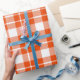 Um papel de embalagem projetado com um padrão de xadrez laranja e branco brilhante em tamanho grande. Personalize o fundo branco entre outras opções.