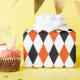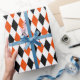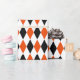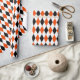 Um papel de embrulho projetado com um padrão de harlequin preto, laranja claro e branco em grande escala. Personalize a cor branca de fundo entre outras opções.