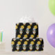 Esfregando papel com uma lama legal vestindo óculos escuros. Vestido num lenço listrado colorido e botas divertidas. Um sol amarelo brilhante com um rosto kawaii feliz no fundo. Triângulos brancos e coloridos rodeiam esta divertida lhama amorosa. Fundo preto.