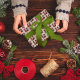Bonita, Elfo de Natal em traje festivo com uma letra de monograma L decorada com decoração floral sobre um fundo de couro bronzeado.