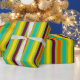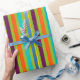Este papel de envolvimento brilhante caracteriza listras corajosas nas máscaras de verde, de roxo, de alaranjado, de azul e de amarelo de nossa paleta de cores retro nova.