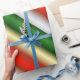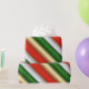 Um papel colorido de embrulho de Natal com faixas diagonais nas tradicionais cores de Natal, vermelho e verde, com listras brancas no meio. Este presente de Natal festivo e atraente fará com que seus presentes sob a árvore de Natal se sobressaiam para os amigos sortudos e familiares que recebem seus presentes de Natal este ano!