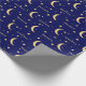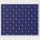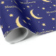 Este papel de embrulho tem luas em crescente e estrelas feitas de queijo amarelo holey suíço no chão com seu nome personalizado ou saudação em um céu azul escuro. Você pode escrever qualquer palavra (ou duas palavras curtas) nesta modelo como o nome de uma criança ou saudação como "feliz aniversário".