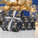 This blue tartan gift wrap features a cute preppy bear holding a gift on a plaid background.