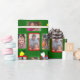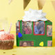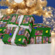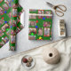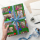Este papel de embrulho tem retângulos arredondados com dentro de fotos e um quadro vermelho ou verde. Também tem lâmpadas de Natal espalhadas.