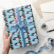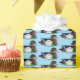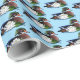 Pato de madeira na água com um lenço de água branco ao lado do pato num pano de fundo de azul