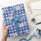 Texto da mãe com flor de margarida branca e pétalas em padrão de gingham branco e azul.