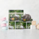 Uma cena serena retrata um ganso branco parado no banco de um lago, observando sobre uma fofoca flutuando em um anel inflável colorido