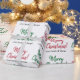 Este design de papel embrulhado tipográfico de Natal apresenta um padrão de mensagens de saudação "Feliz Natal!" vermelho ou verde em texto inspirado na escrita manual. Também apresenta nomes personalizados, e talvez possa ser usado como uma forma divertida de embrulhar presentes em comemoração do Natal.