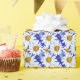 Papel de enrolamento num padrão de cor d'água de margaridas brancas com centros ouro amarelos, sobre fundo em tons de azul denim