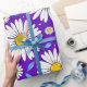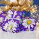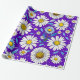 Um padrão contínuo colorido apresentando margaridas com centros amarelos, folhas azuis e um fundo roxo vibrante. Perfeito para temas de primavera, designs de tecidos e artesanatos digitais ou impressos alegres.