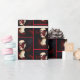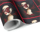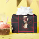 Uma mulher cabeleira negra vestindo uma máscara de mascarada de borboleta vermelha com borboletas vermelhas ao seu redor no cenário preto